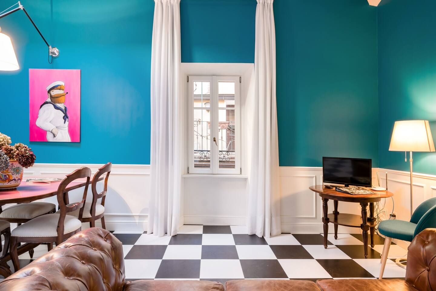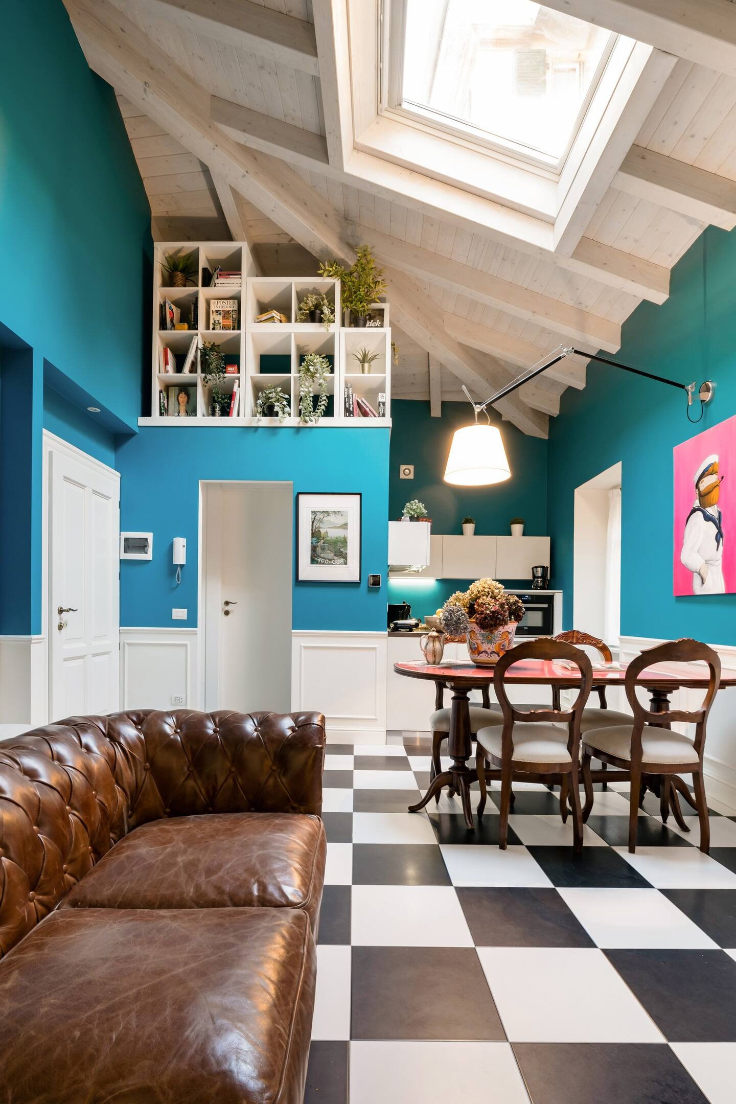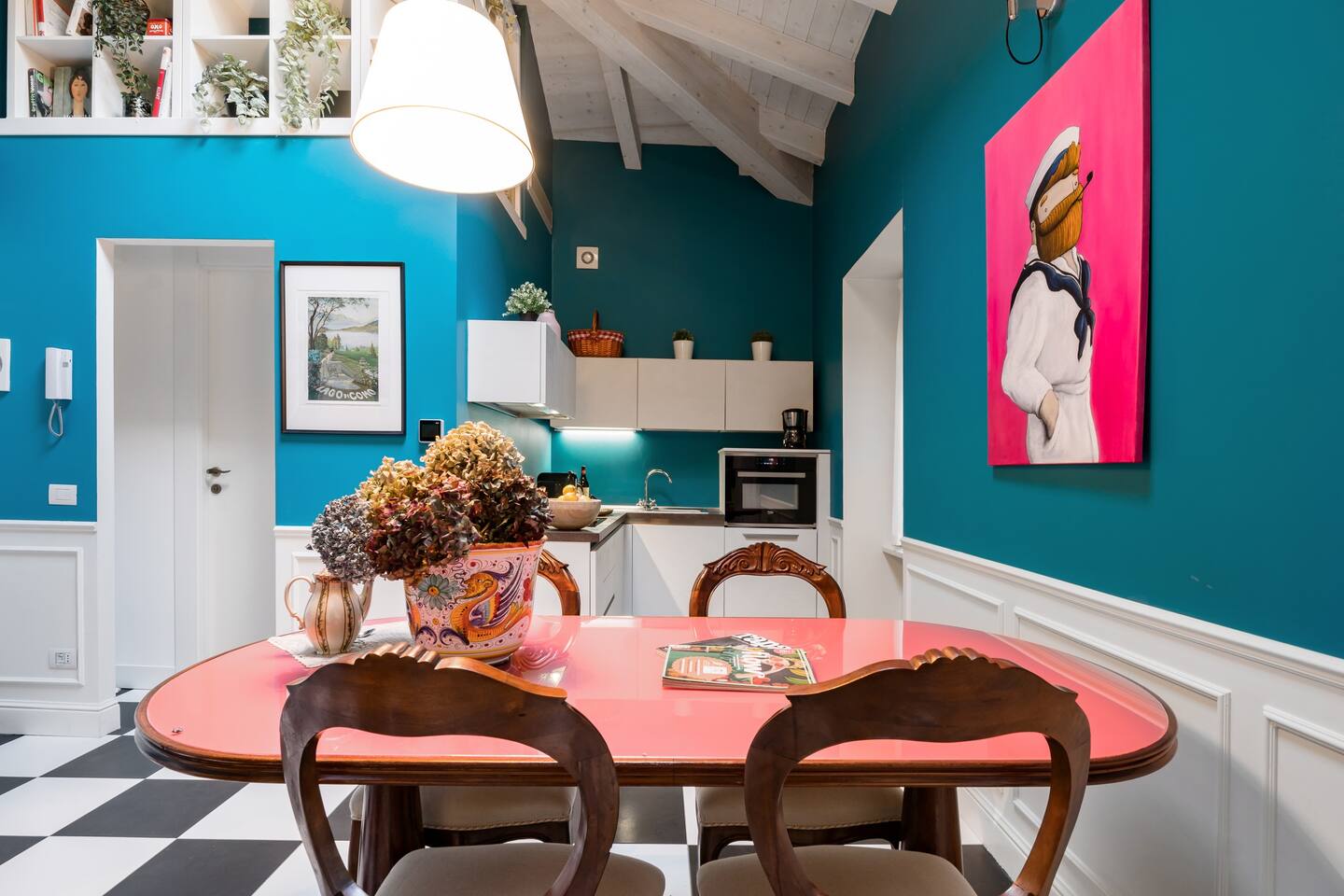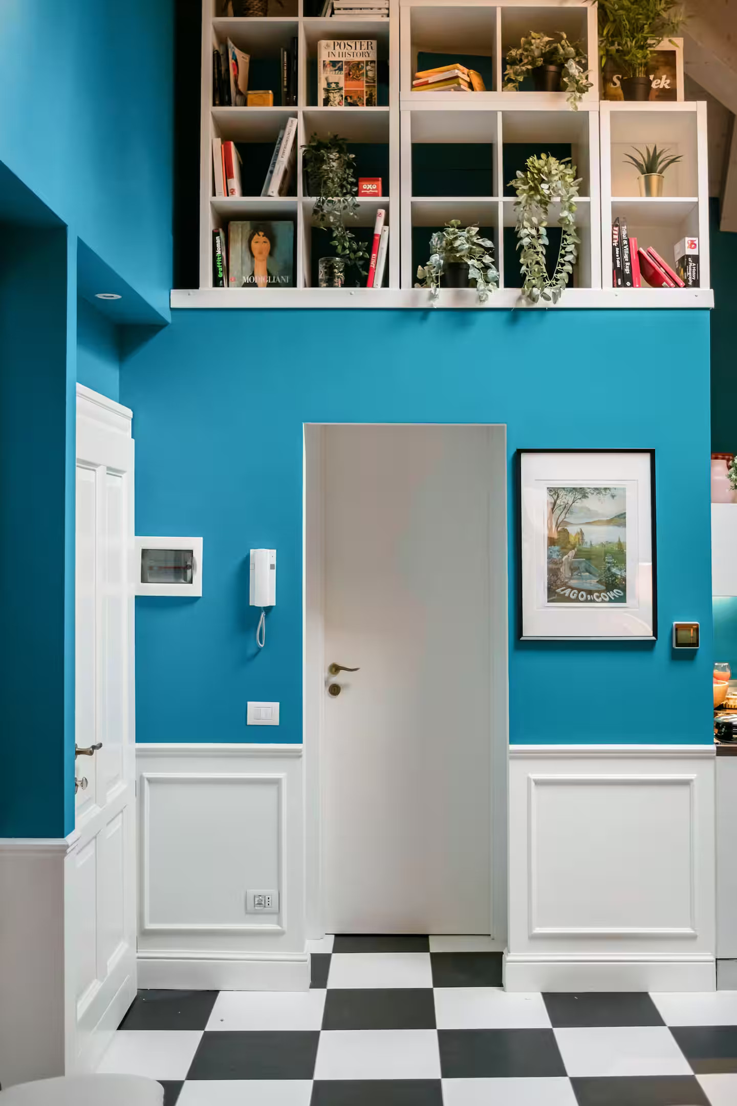 Italian lakes are known the world over for their beauty, and there are many in the north of the country. Bellagio is home to this colourful vintage flat on Lake Como, which is located in the middle of the town and just a few minutes' walk from the shore. The decor is enlivened by the strong presence of blue on the walls and its harmony with the floor covered in a very mid-century black and white chequered pattern.