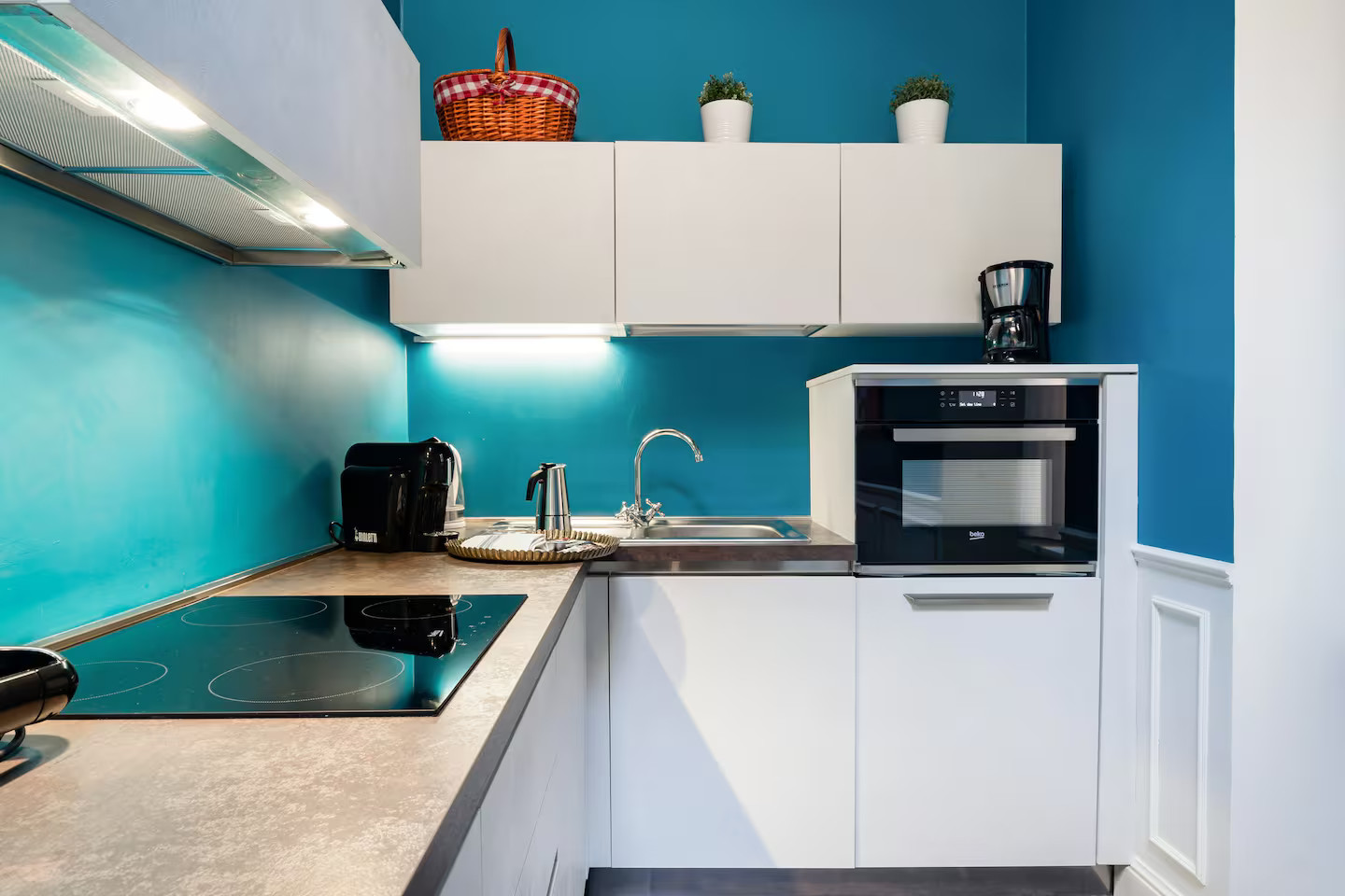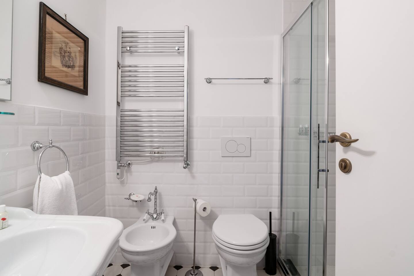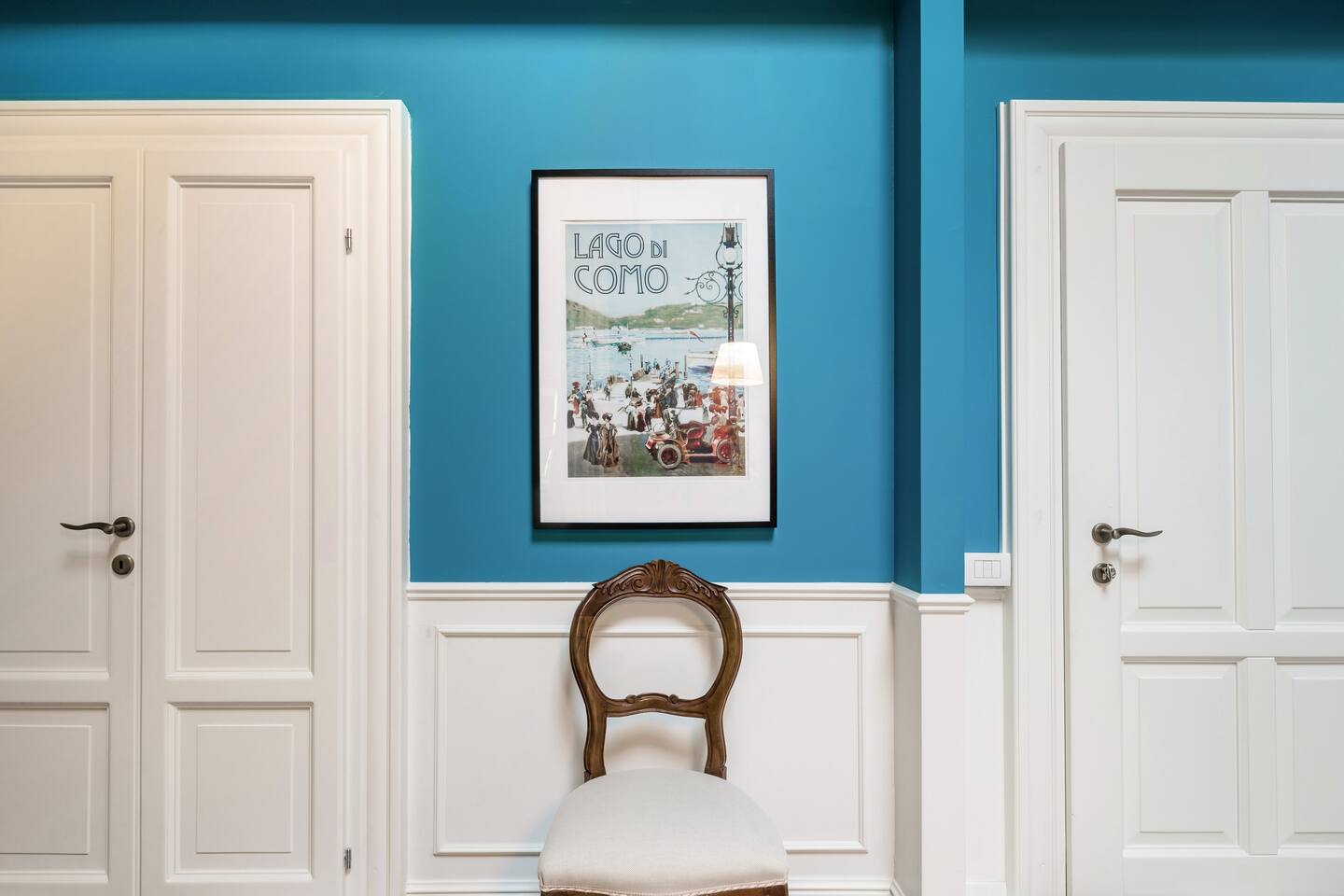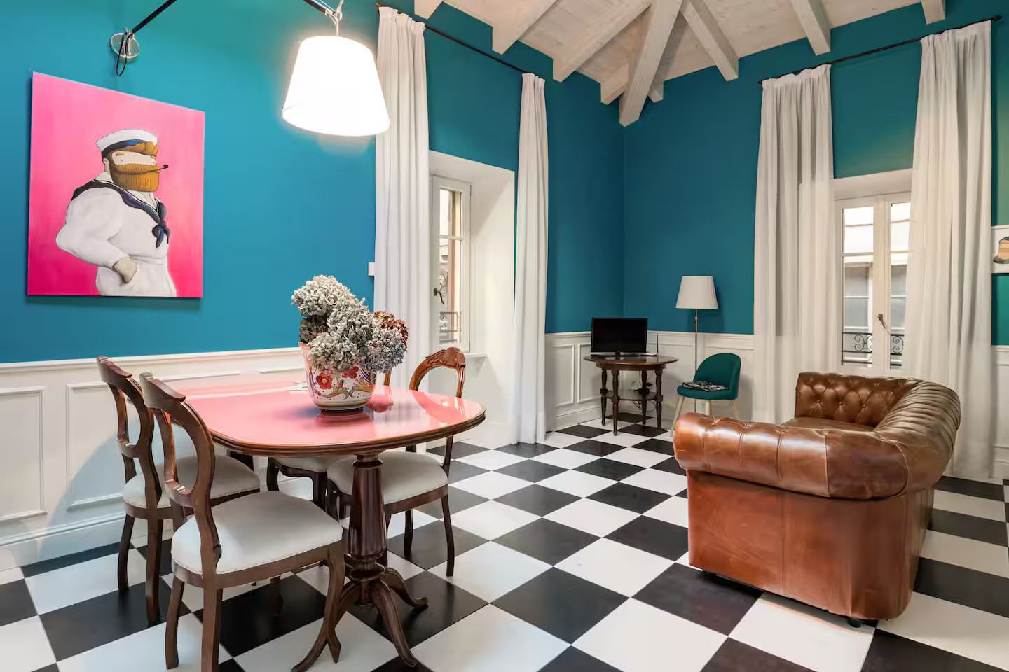 Italian lakes are known the world over for their beauty, and there are many in the north of the country. Bellagio is home to this colourful vintage flat on Lake Como, which is located in the middle of the town and just a few minutes' walk from the shore. The decor is enlivened by the strong presence of blue on the walls and its harmony with the floor covered in a very mid-century black and white chequered pattern.