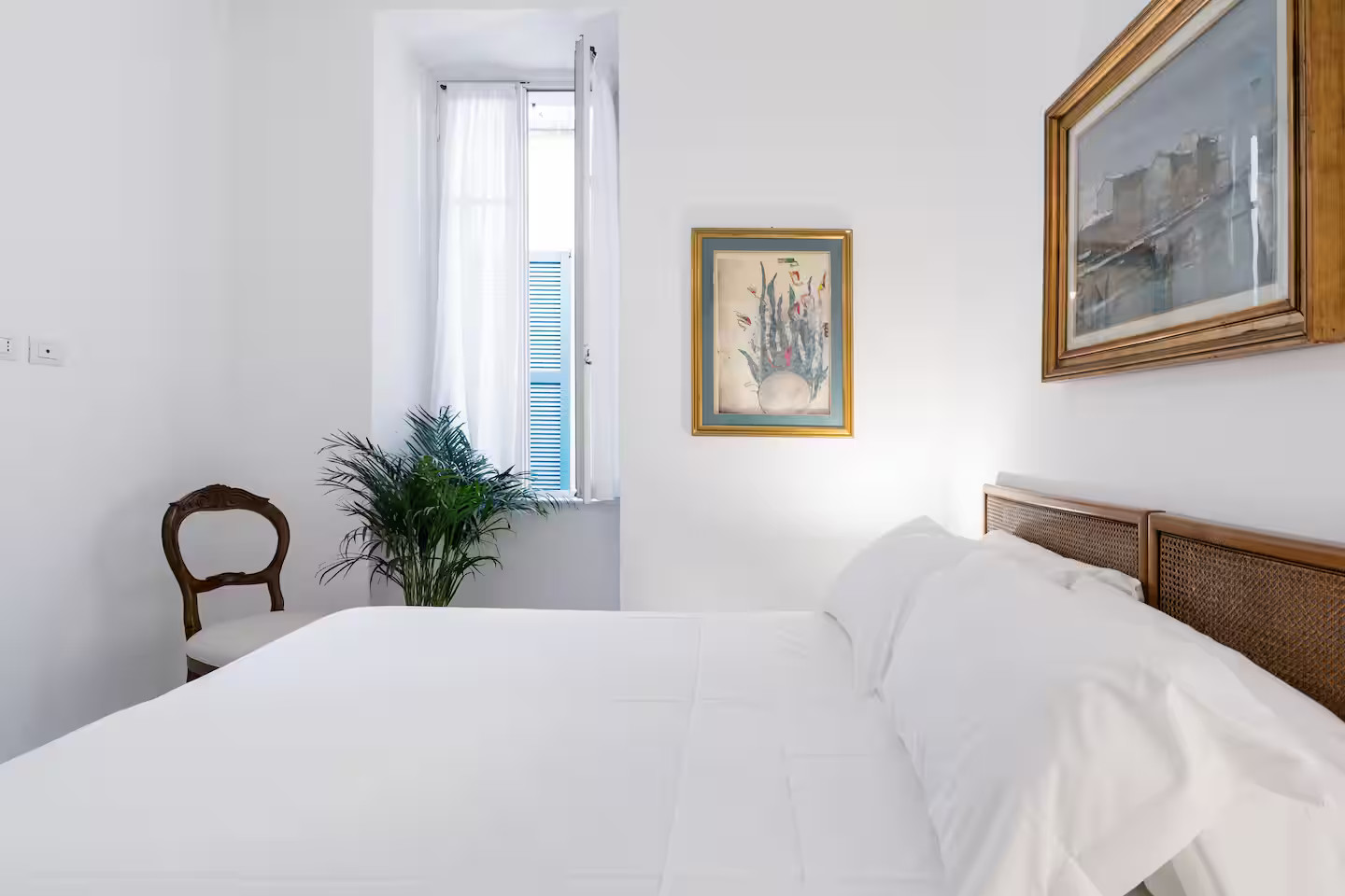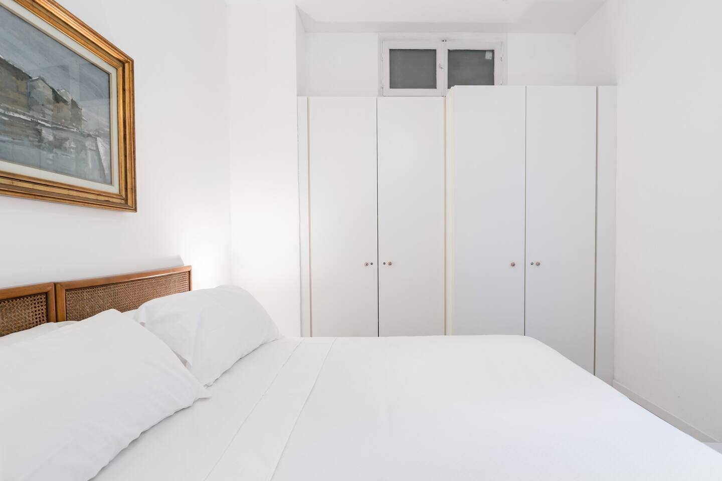The bedroom contrasts with this exuberance, adopting an understated white. It is furnished with antique family furniture, such as the table and chairs, and a Chesterfield sofa in weathered leather. The modern, open-plan kitchen is discreetly installed in a corner of the main room. The moulded base panels and beams add old-world charm to this flat, which is unlike any other, both in terms of its decor and its furnishings.