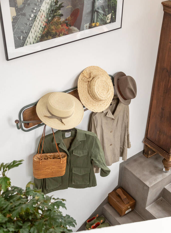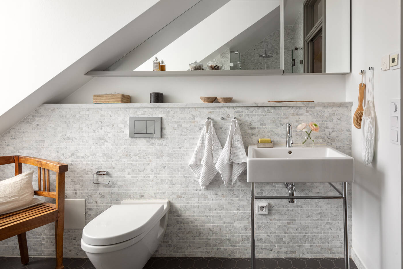 From the large living room, which includes the lounge, open-plan kitchen and dining room, a small staircase leads up to the 20m2 terrace, adding to the flat's living space. The decor is a mix of styles, from contemporary to vintage, from designer, as in the bathroom, to industrial with the glass panels, with lots of neutral colours and a few splashes of colour to tie the various elements together.