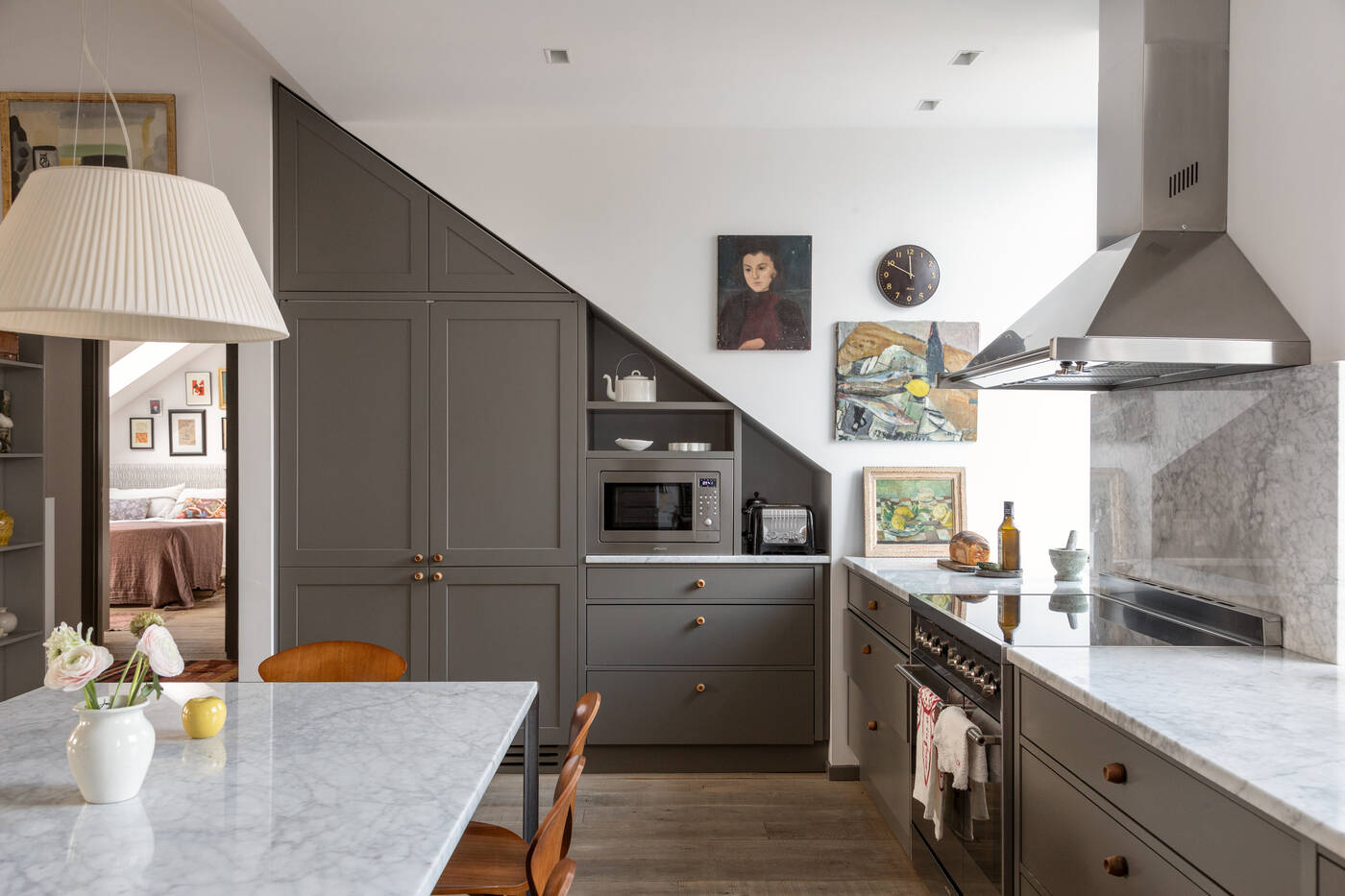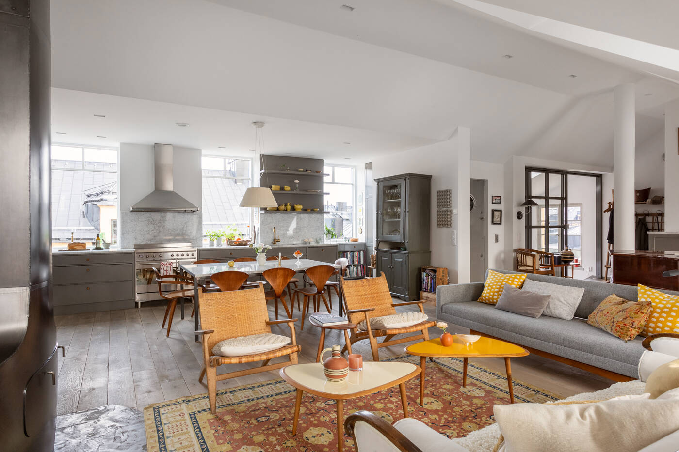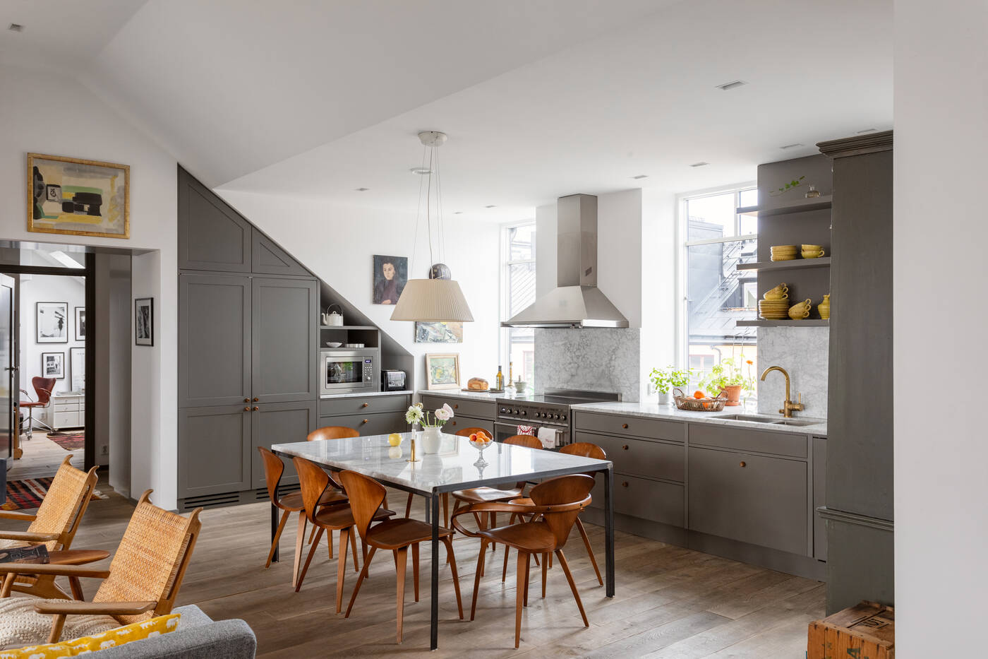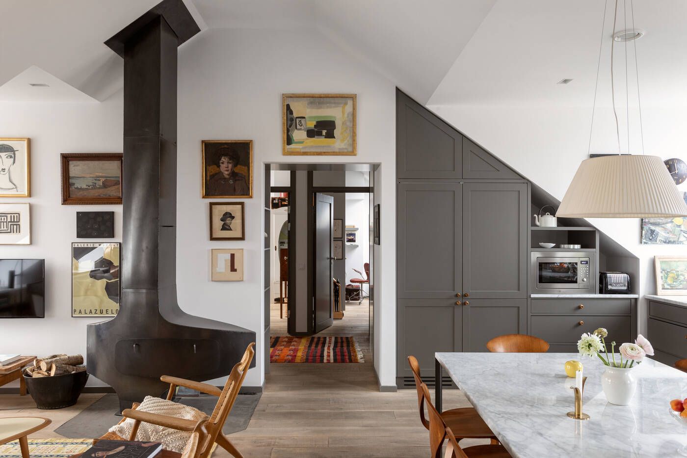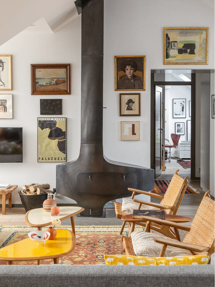 The top-floor location of this 149m2 family flat gives it two very pleasant features: a sky terrace and a fireplace in the living room, a black steel Hétérofocus model from Focus. Located in the attic of a building built in Stockholm in 1929, the atypical, multi-level volumes give this apartment a great deal of charm.