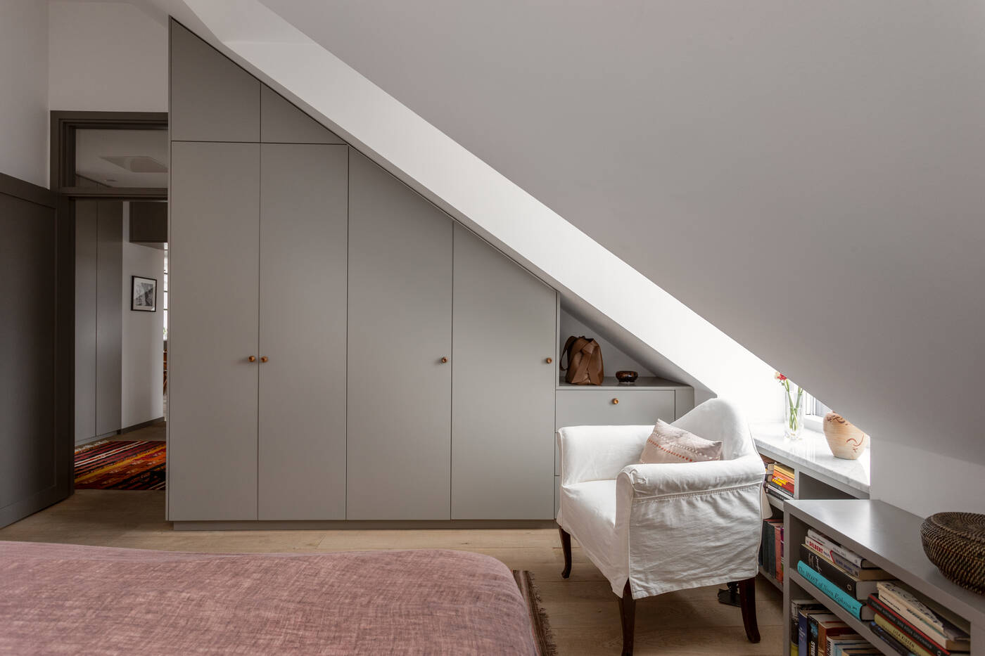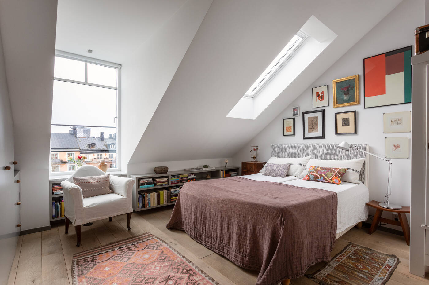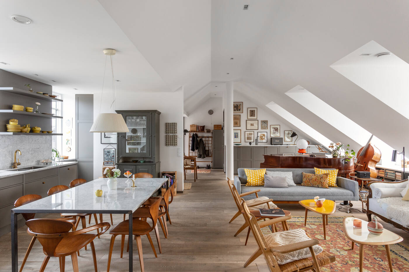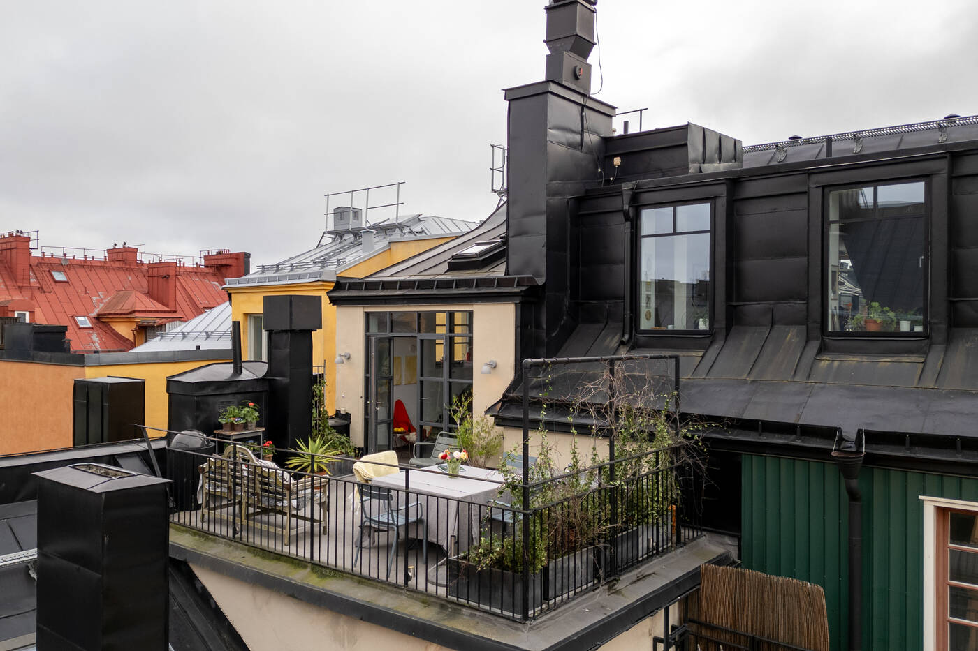 The top-floor location of this 149m2 family flat gives it two very pleasant features: a sky terrace and a fireplace in the living room, a black steel Hétérofocus model from Focus. Located in the attic of a building built in Stockholm in 1929, the atypical, multi-level volumes give this apartment a great deal of charm.