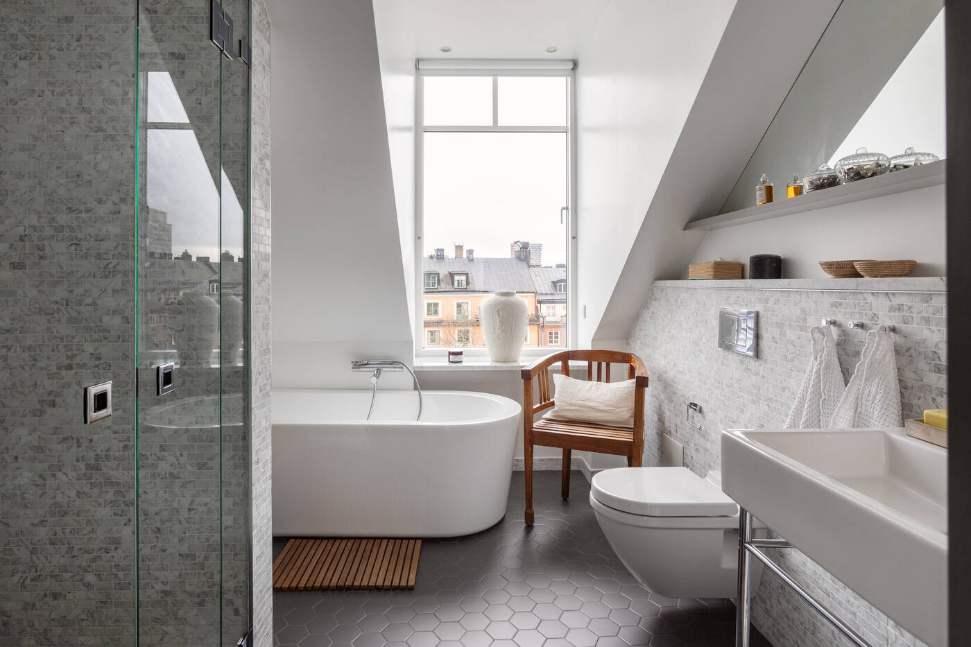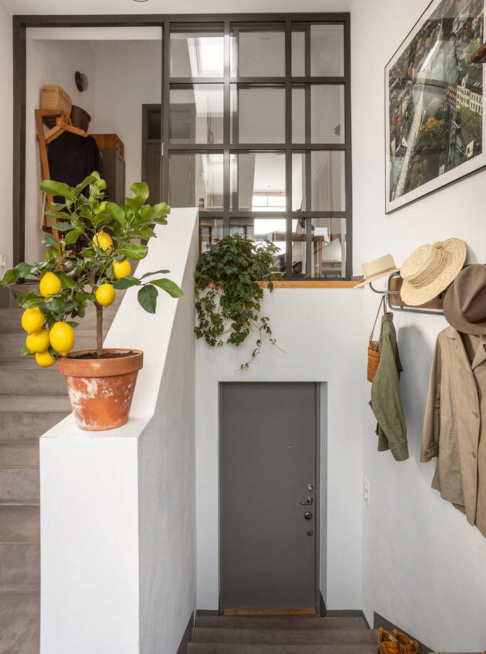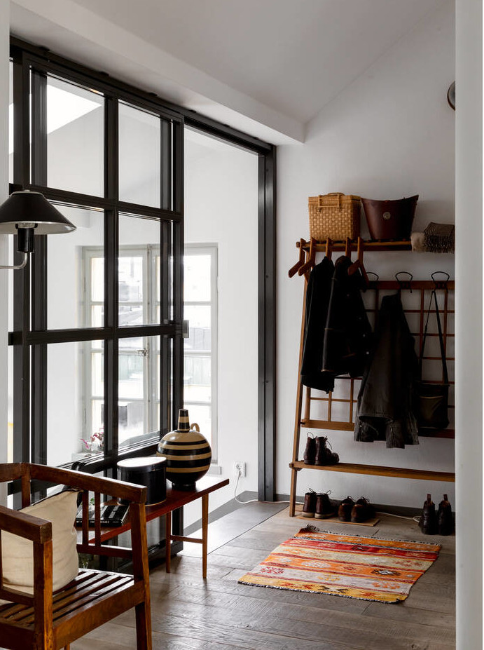 La situation en dernier étage de cet appartement familial de 149m2 lui permet de posséder deux éléments très agréables, une terrasse en plein ciel, et une cheminée dans le salon, un modèle en acier noir Hétérofocus de chez Focus. Situé dans un bâtiment construit en 1929 à Stockholm, dans les combles, il présente des volumes atypiques et multi-niveaux qui lui donnent beaucoup de charme.